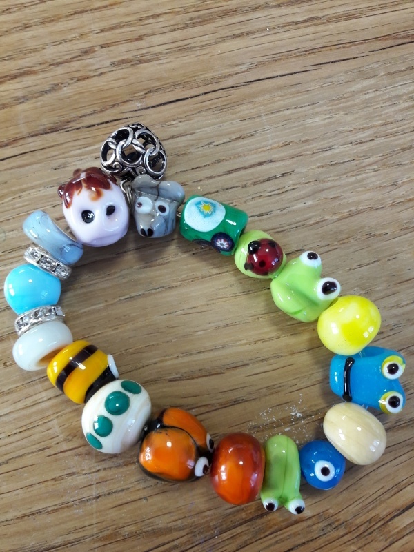 Das elastische Armband, bestehend aus mind. 10 Glasperlen, kann als lustiger Schmuck immer getragen und bei "Geschichte-in-Not" hilfreich eingesetzt werden, wie ein 3-dimensionales Kinderbuch.